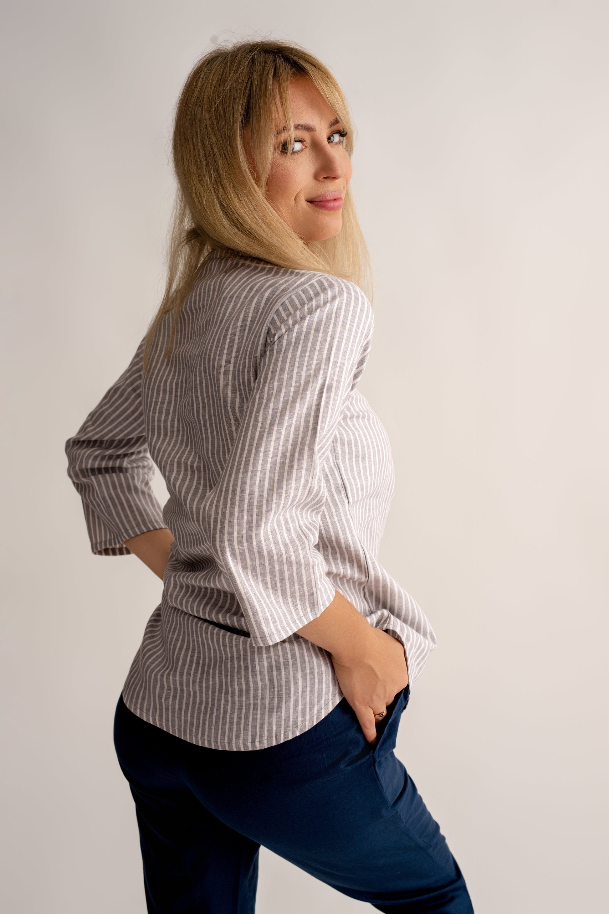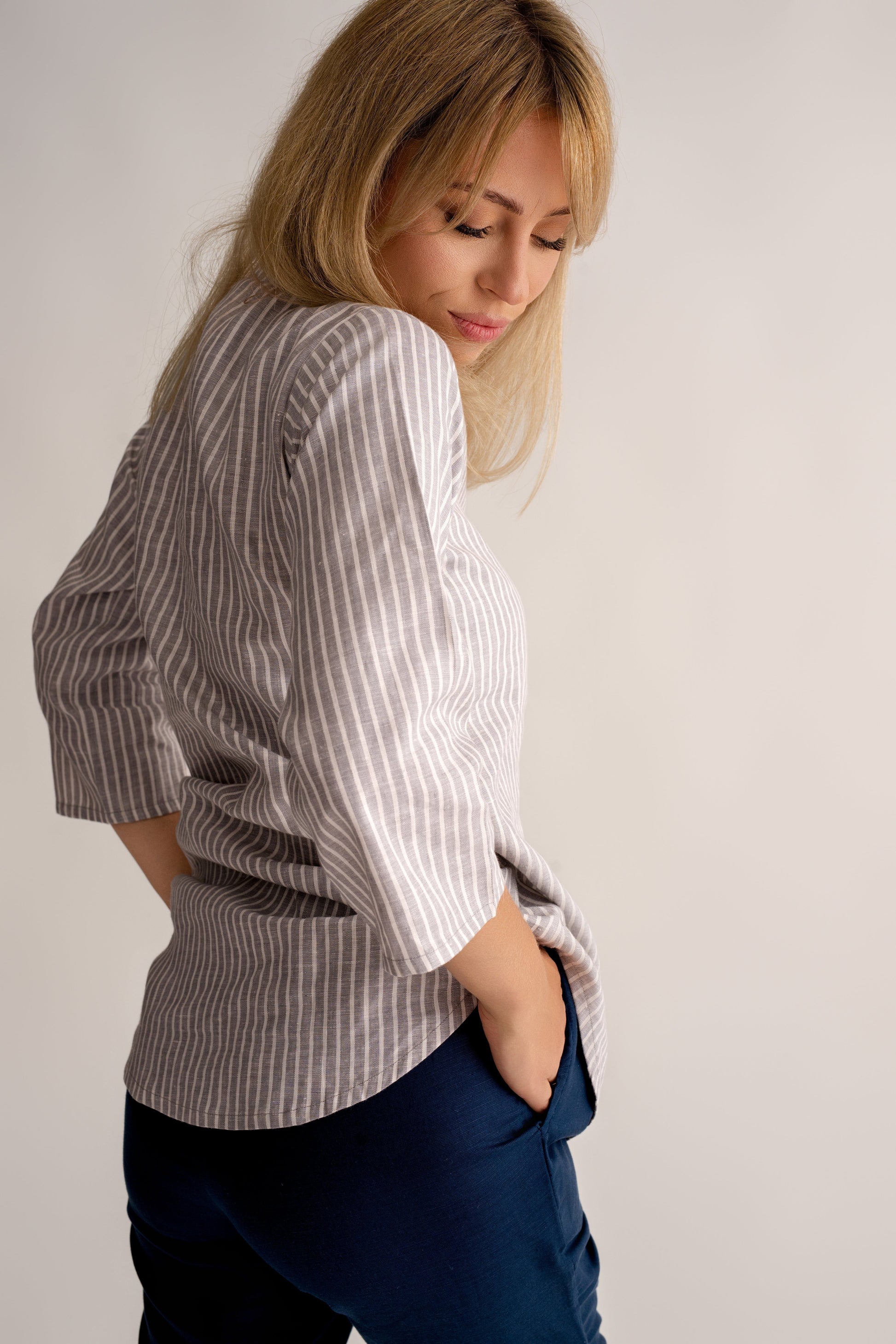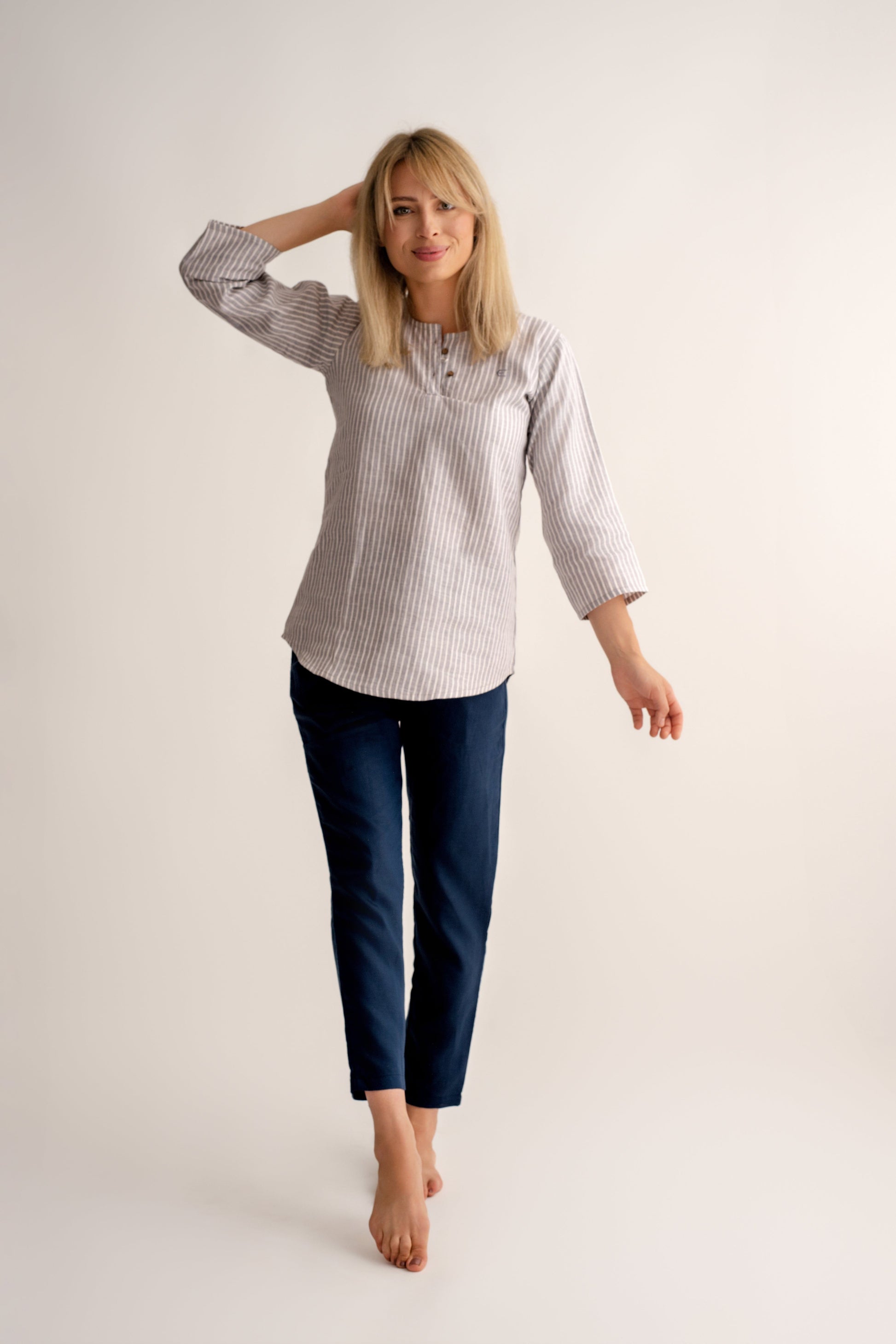 Zaprojektowana z myślą o swobodzie ruchu. Luźny krój z rękawami 3/4 , subtelnym zapięciem na guziki henley i wysokim/niskim dołem zapewniają dobre krycie i łatwość noszenia na spodniach lub spódnicach.